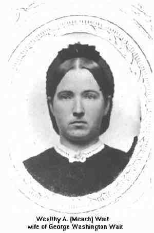 Wealthy married George Washington Wait, son of Samuel Wait Sr. and Rachael Judd, on 23 Apr 1857 in , Portage Co., OH. (George Washington Wait was born in 1832, died in 1911 in Waylandtwp, Allegancty, MI and was buried in Elmwood Cemetary, Waylandtwp, Allegancty, MI.) |