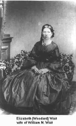 Elizabeth married William N. Wait, son of Samuel Wait Sr. and Rachael Judd, on 26 Oct 1856 in Newberry, Geauga Co. Ohio. (William N. Wait was born in 1823 in Mass, died in 1896 in Newbury, Geauga Co., OH and was buried in Newbury, Geauga Co., OH, Center Cem..)